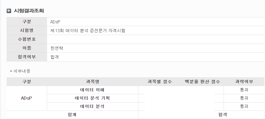 제13회 ADsP 시험 합격했습니다.