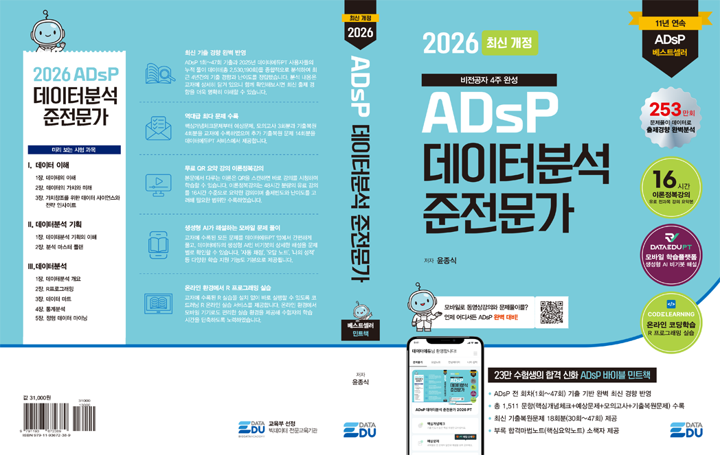 수험생의 편리한 학습을 위해 모바일에서 교재 내 문제를 풀어볼 수 있는 맞춤형 학습 솔루션 데이터에듀PT의 'ADsP 데이터분석 준전문가 2026 PT' 콘텐츠를 제공합니다. 해당 콘텐츠는 데이터에듀의 생성형 AI '비기봇'을 통해 상세한 해설을 제공하여 한정된 지면으로 부족했던 해설에 대한 수험생의 니즈를 반영하였습니다.